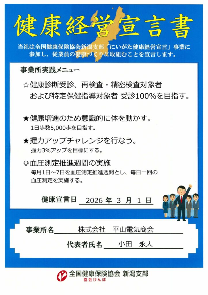この度、弊社は本年も昨年までに引き続き、弊社の健康経営理念に基づき健康経営宣言を致します。